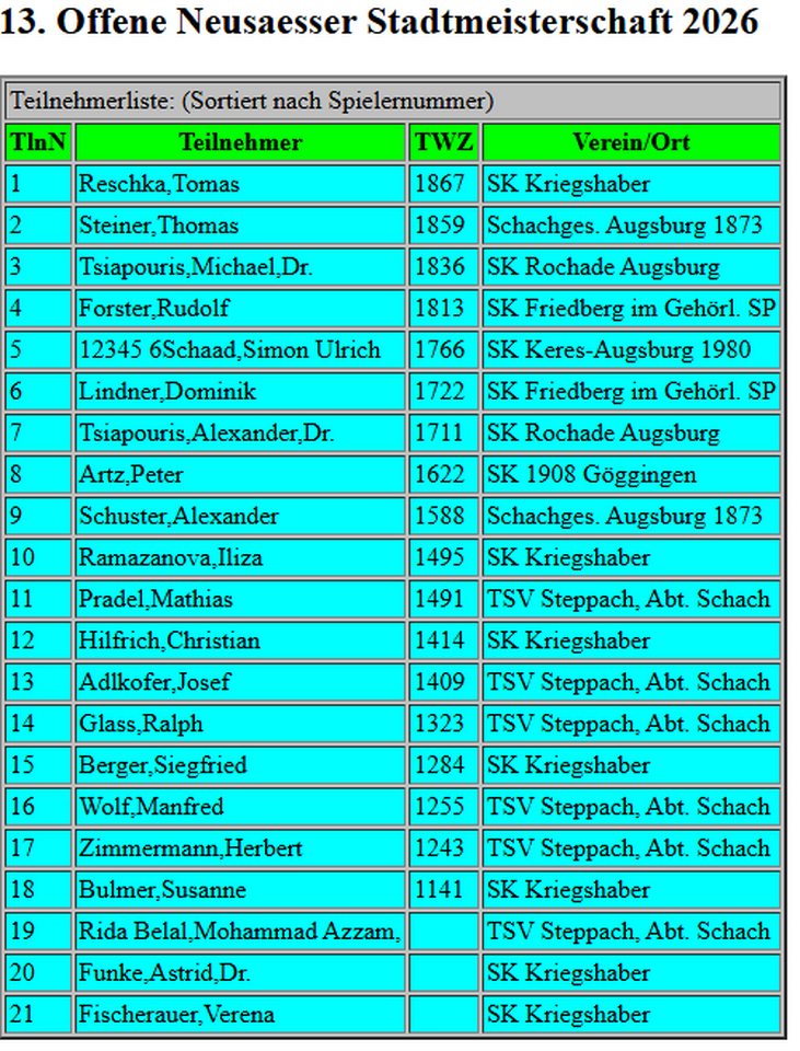 Ausschreibung der 13. Offenen Neusässer Schach-Stadtmeisterschaft 2026 Ausschreibung der 13. Offenen Neusässer Schach-Stadtmeisterschaft 2026